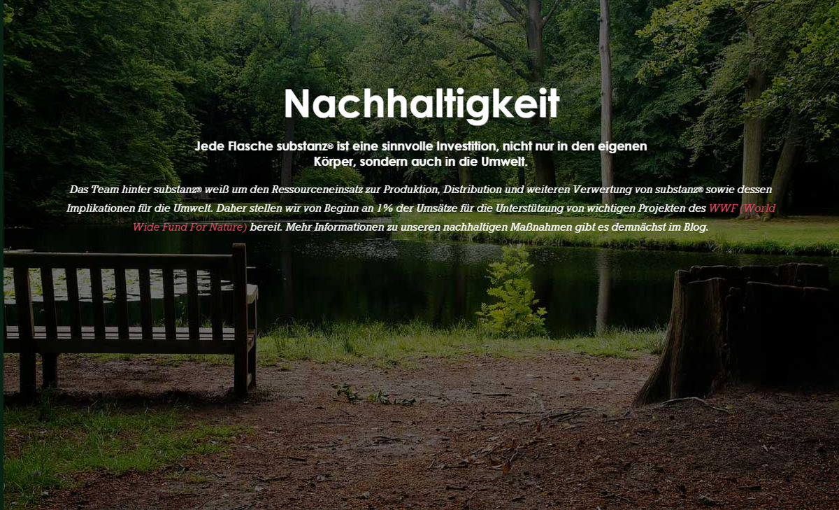 Wenn man das weiß, kann es also nicht sinnvoll sein ein neues „cooles“ Startup aus dem Boden zu stampfen, ohne über den Tellerrand hinaus zu schauen. Genau deshalb stellen wir von Anfang an 1% unserer Umsätze mit substanz dem WWF für ausgewählte Projekte zur Verfügung. Die inhaltlichen Werte von substanz basieren auf Nachhaltigkeit (Stichwort: langanhaltende Energie). Um substanz jedoch für das große Ganze sinnvoll und nachhaltig aufzustellen, bedarf es mehr. Wir wollen mit dieser Rückführung dafür sorgen, dass substanz in Hinsicht auf den ökologischen Fußabdruck zumindest neutralisiert wird. Ob genau 1% der Umsätze dafür ausreicht, wissen wir heute noch nicht. Doch bis Ende des Jahres und einer besseren Datenlage planen wir, euch genauere Informationen zu geben, wo substanz steht und ob ein nachhaltiger Vertrieb realisiert werden kann.